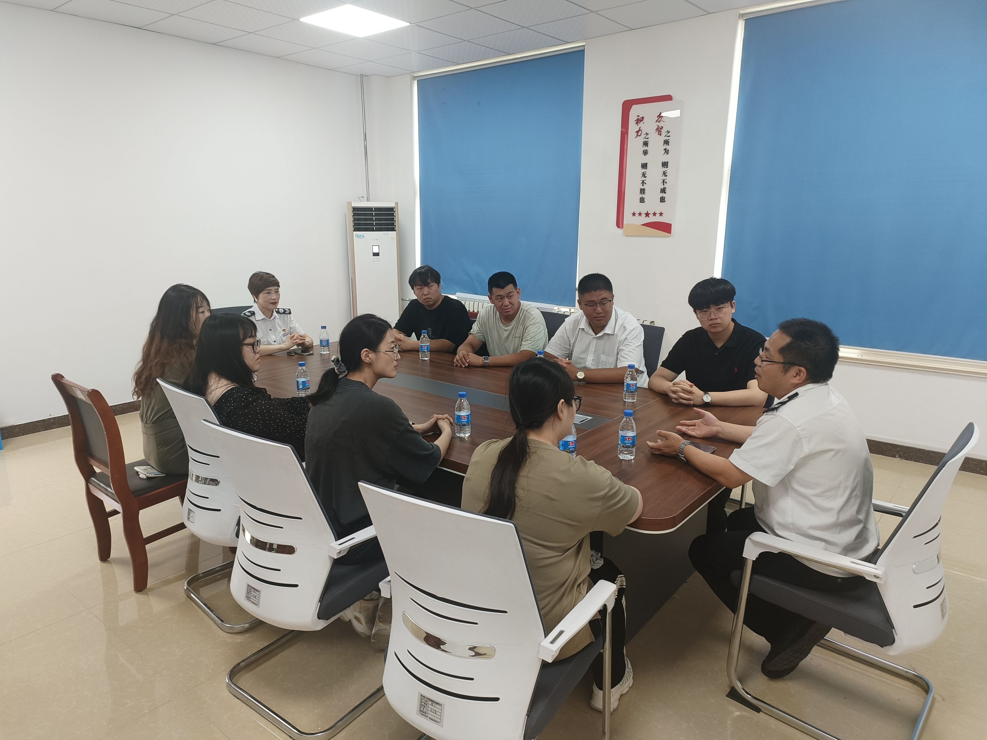 參觀結束后,雙方在二樓小會議室舉行座談會。郝主任介紹了此次參觀的目的,強調(diào)實踐學習對大學生職業(yè)成長的重要性,并希望實習生們能在未來的工作中將理論知識與實際業(yè)務相結合。賈經(jīng)理則分享了東里場站在運營管理、黨建融合及技術創(chuàng)新方面的經(jīng)驗,鼓勵實習生積極投身公交事業(yè),為城市交通發(fā)展貢獻力量。